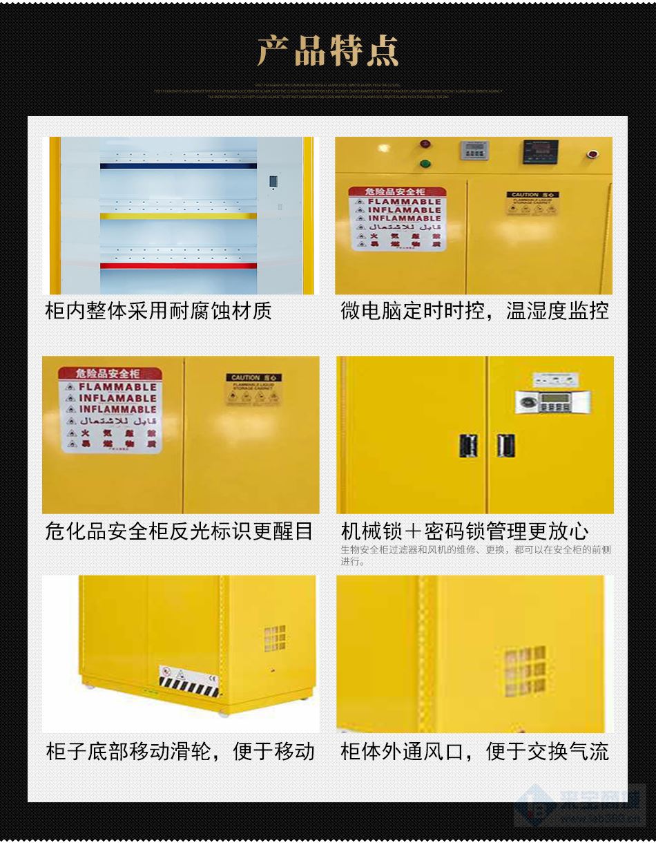 柜底装有四个Φ60mm的移动钢轮,便于易燃品毒害品储存柜移动;
