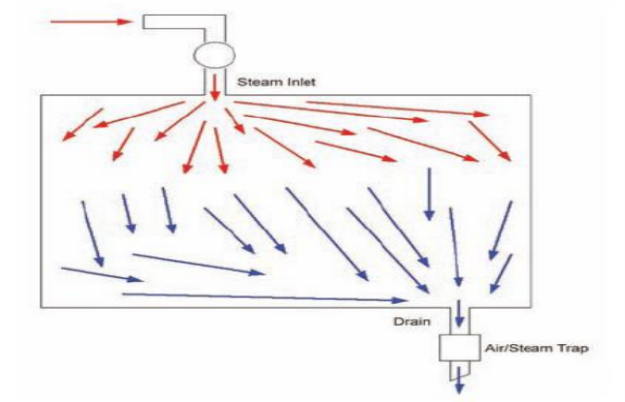 灭菌柜腔室中的冷空气比进入的蒸汽重,因而下沉到腔室的底部。蒸汽从灭菌柜上部进入腔室,迫使冷空气从腔室底部的排水管排出。也就是我们通常所说的“置换”,如下图。