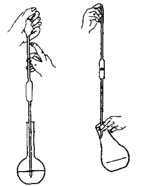 再用水连续振荡数次,必要时用蒸馏水淋洗三次。洗净状态下,水均匀分布不挂水珠(如左图所示);未洗净状态下,器壁挂着水珠(如右图所示)。