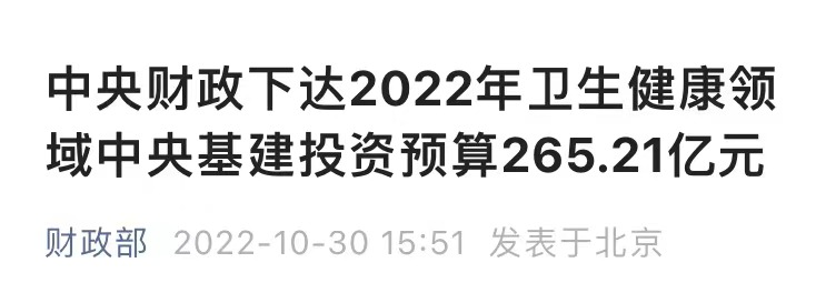近日,据财政部官微消息,中央财政下达2022年卫生健康领域中央基建投资预算265.21亿元,推动“十四五”102项重大工程和《“十四五”优质高效医疗卫生服务体系建设实施方案》等任务落地。