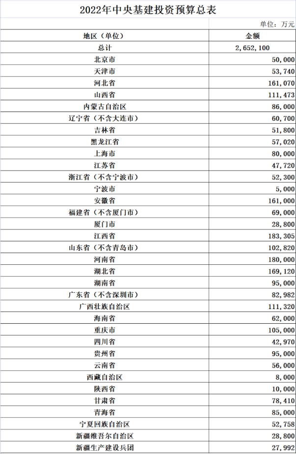 各省中央基建投资预算如下(各省详细项目见后文):