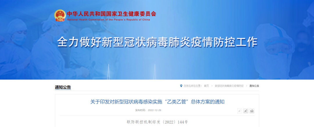 12月26日,国务院应对新型冠状病毒感染疫情联防联控机制综合组印发《关于对新型冠状病毒感染实施“乙类乙管”的总体方案》。