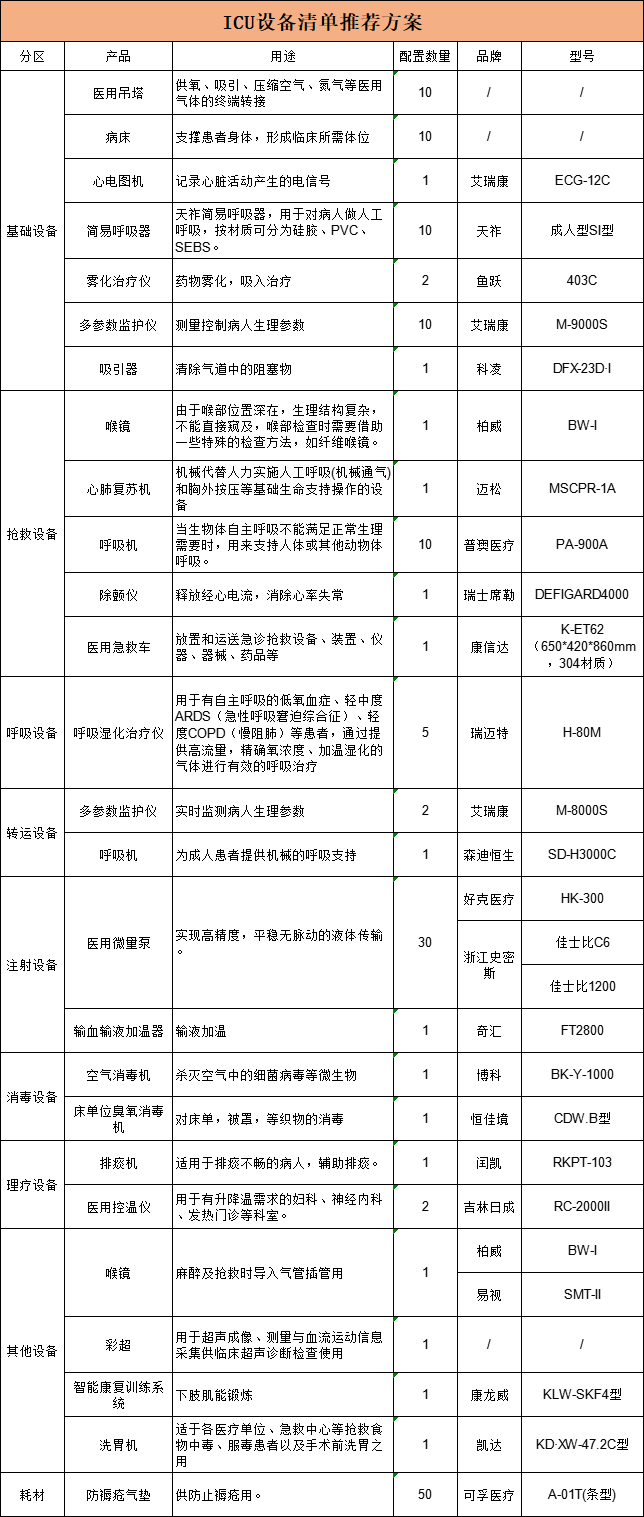 国家推进重症设备配置,ICU设备备受重视,各地在推进过程中政策支持与补助力度显著加强,有关设备清单已整理??????