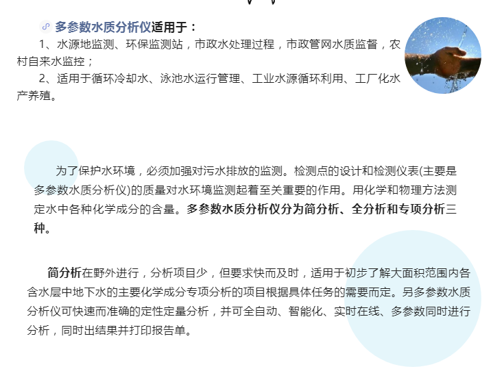 为了?;に肪常匦爰忧慷晕鬯欧诺募嗖?。检测点的设计和检测仪表(主要是多参数水质分析仪)的质量对水环境监测起着至关重要的作用。用化学和物理方法测定水中各种化学成分的含量。多参数水质分析仪分为简分析、全分析和专项分析三种。
