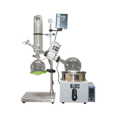蒸发瓶恒速旋转,水浴锅恒温加热,在此条件下:物料在蒸发瓶内壁形成大面积均匀薄膜快速蒸发,在真空条件下可以提高蒸发效率(需连接真空装置),溶媒蒸汽经玻璃冷凝盘管时冷却成液体(需连接冷却装置),回收于收集瓶。