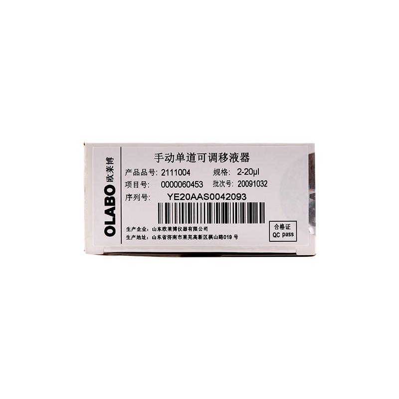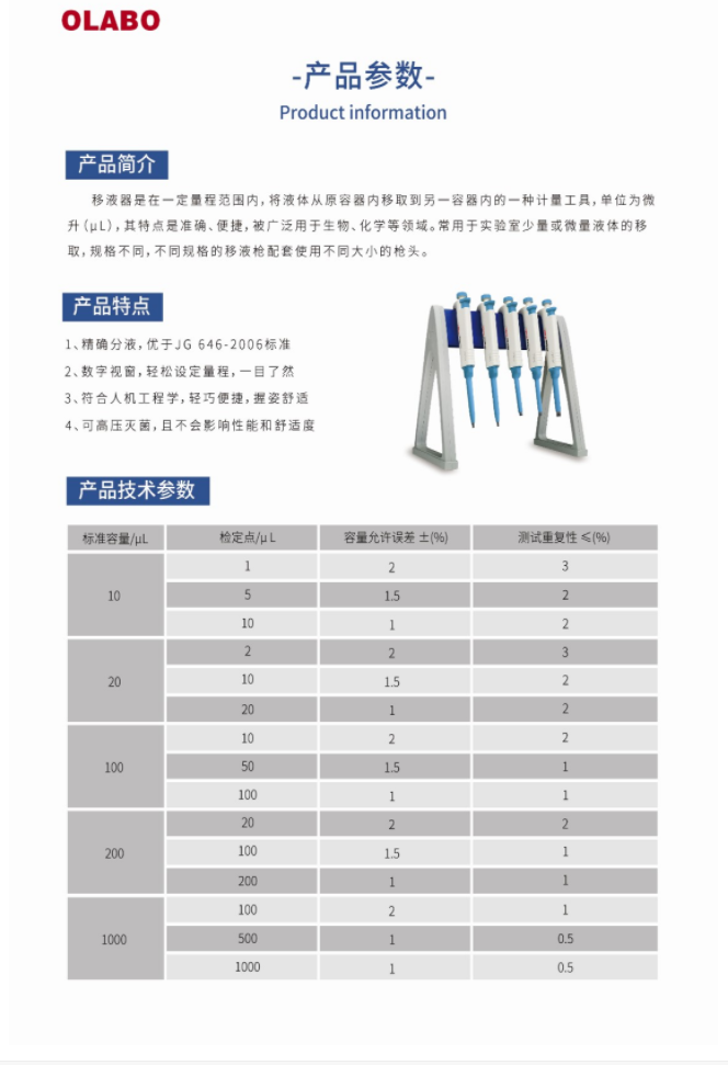 国产OLABO,B系列单道可调式移液器2-20μl量程:2-20μl,精确分液,数字视窗,符合人体工学,握姿舒适