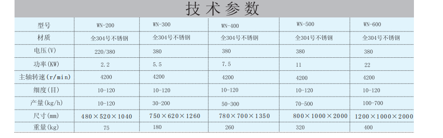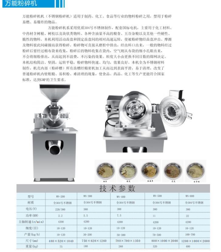 WN-200全能粉碎机产量10-120kg/h,不锈钢制作,本机结构简洁,坚固,运转平稳,粉碎物料快速,均匀,效果良好。
