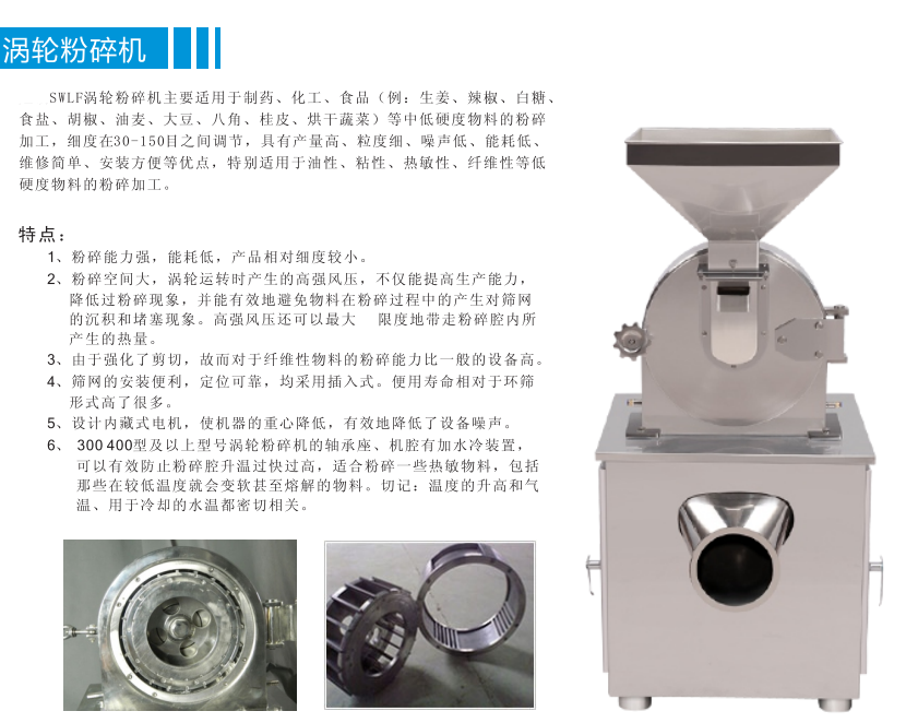 SWLF-200涡轮粉碎机特别适用于油性、粘性、热敏性、纤维性等低硬度物料的粉碎加工