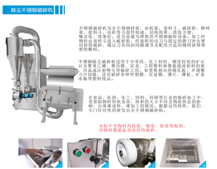 PE-180S系列除尘不锈钢破碎机附带除尘效果,结构简单,清洗方便,噪音低,效果好。