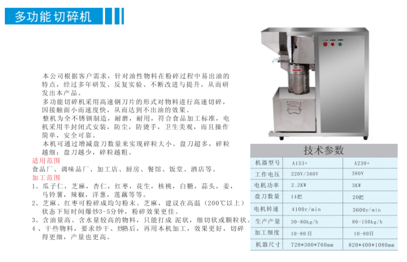 A153多功能切碎机接触面小速度快,从而达到不出油的效果,全体不锈钢,制造,耐磨,耐用,电机采用半封闭式安装,防尘,防烫手,卫生美观?!?
