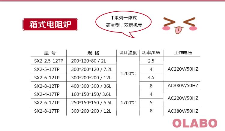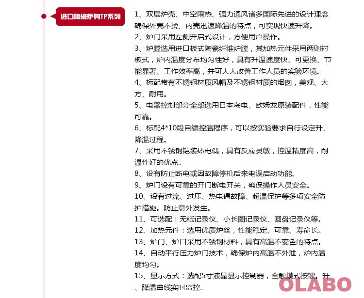 1、T系列炉膛---硅酸铝陶瓷纤维炉膛是传统炉膛的升级换代产品,具有重量轻、升温速度快、节能、省时等特点,能满足各种快速烧结的要求。 2、新一代PID智能控温仪具有控温精度高、操作简单、易学的特点。 3、炉门结构采用全方位密封技术。具有开启方便、安全,并确保炉内高温气体不外漏,达到节能、环保的目的。 4、具有安全保障措施:本系列电阻炉设有过压、过流、炉体表面过热?;け;た亍A砩栌蟹乐构┑缦呗吠5缁指春?,在无人值守情况下电阻炉继续加热功能;及开启炉门后,炉膛停止供电装置等保护设施。